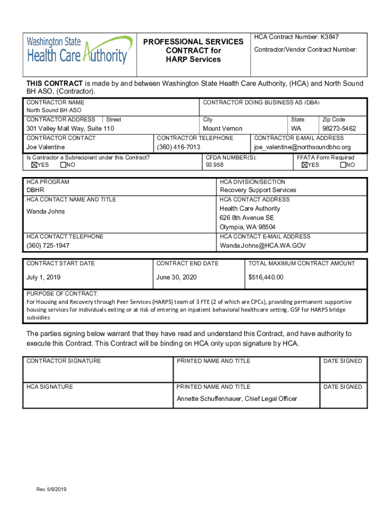 HCA Contract Number: K3847PROFESSIONAL SERVICES CONTRACT for HARP ServicesContractor/Vendor Contract Number:THIS CONTRACT is made by and between Washington State Health Care Authority, (HCA) and North