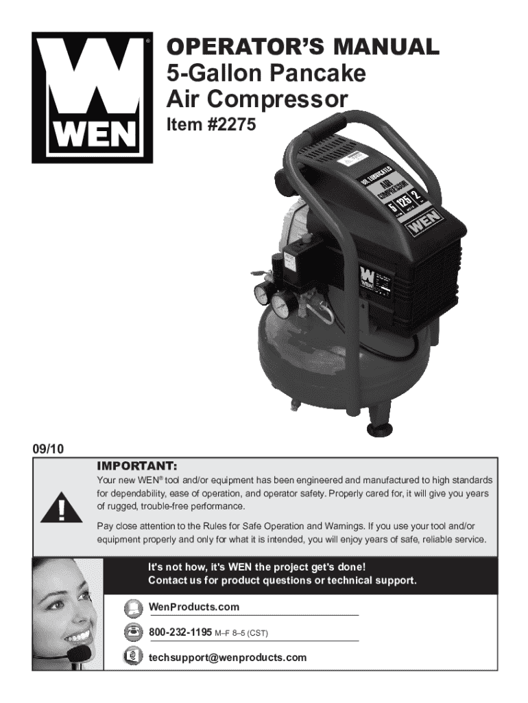 OPERATORS MANUAL5Gallon Pancake Air Compressor Item #227509/10IMPORTANT:Your new WEN tool and/or equipment has been engineered and manufactured to high standards for dependability, ease of operation,