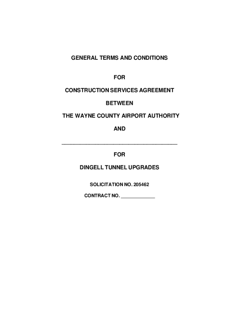 This document outlines the general terms and conditions for a construction services agreement between the Wayne County Airport Authority and a contractor. It includes definitions, responsibilities of both parties, payment procedures, safety measures, and regulations regarding changes in work. The document aims to ensure that both the contractor and the Airport Authority understand their duties and the legal framework governing the execution of the project.