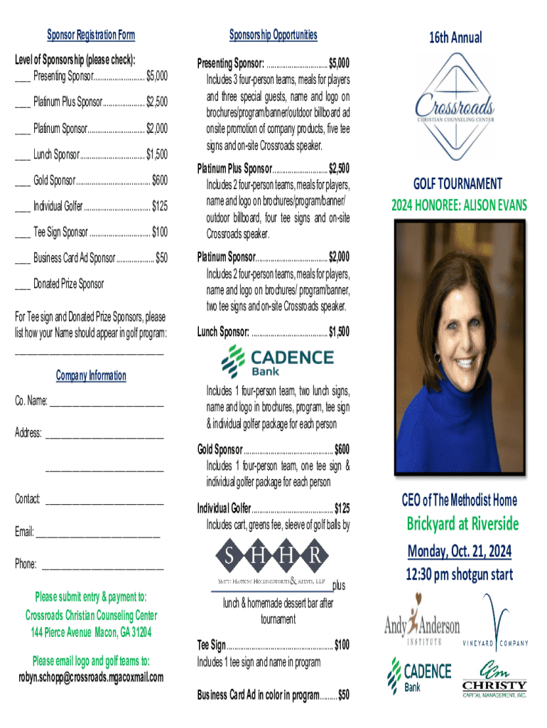 This document outlines the sponsorship levels available for the 2024 Golf Tournament organized by Crossroads Christian Counseling Center, including details on costs, benefits of each sponsorship level, and instructions for registration. It highlights the honoree for this year\'s event, Alison Evans, and provides information about Crossroads Christian Counseling Center\'s mission and history.