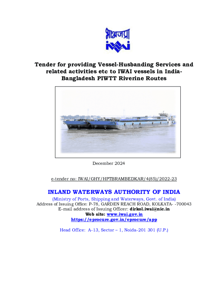 This document concerns the tender issued by the Inland Waterways Authority of India for providing vessel-husbanding services and related activities for IWAI vessels operating in the India-Bangladesh PIWTT Riverine Routes. It includes detailed instructions for bidders, criteria for eligibility, submission deadlines, and the processes involved in the tendering operation.