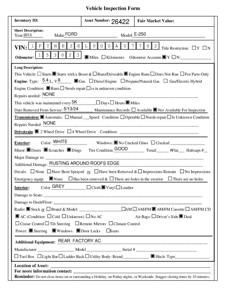 Vehicle Inspection Form Inventory ID:Asset Number:Short Description: 2013 Year___Fair Market Value:26422FORD E250 Make___ Model___1 Do F notTcloseN items E on2or surrounding E L 0a Holiday, D Don