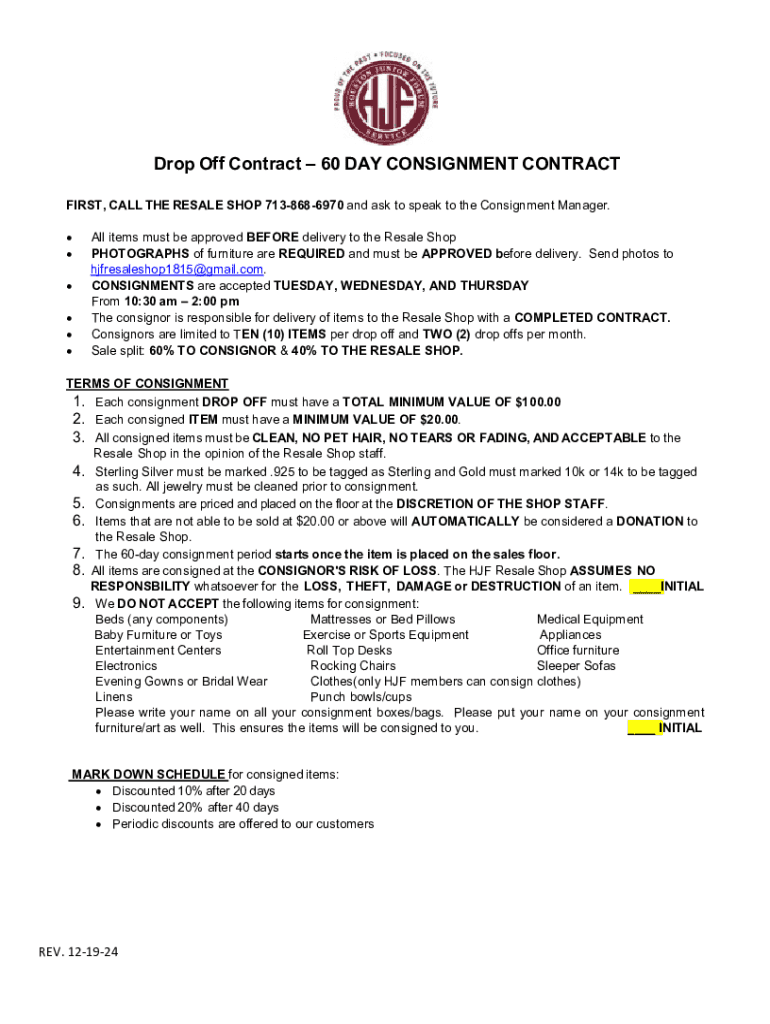 This document outlines the terms and conditions for consigning items at the HJF Resale Shop. It details the approval process for items, requirements for delivery, sales split, consignment periods, item restrictions, pricing, markdown schedules, and procedures for reclaiming unsold items. Consignors must adhere to the outlined policies to successfully sell their items through the shop.