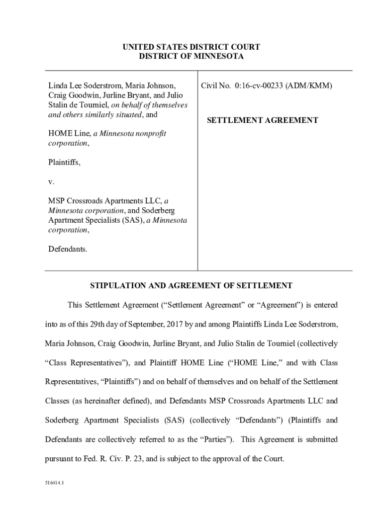 This Settlement Agreement resolves a class action lawsuit filed by Linda Lee Soderstrom and others against MSP Crossroads Apartments LLC and Soderberg Apartment Specialists for alleged violations of the Fair Housing Act. The agreement outlines the terms of settlement, including payment distributions, changes to screening criteria for tenancy, and the establishment of Settlement Classes. It aims to provide equitable relief to affected individuals while addressing legal claims and ensuring...