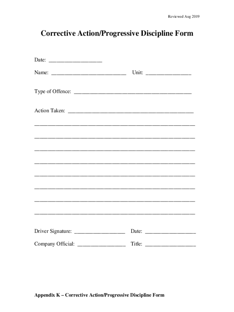 Reviewed Aug 2019Corrective Action/Progressive Discipline FormDate: ___ Name: ___Unit: ___Type of Offence: ___Action Taken: ___ ___ ___ ___ ___ ___ ___ ___ ___Driver Signature: ___Date: ___Company