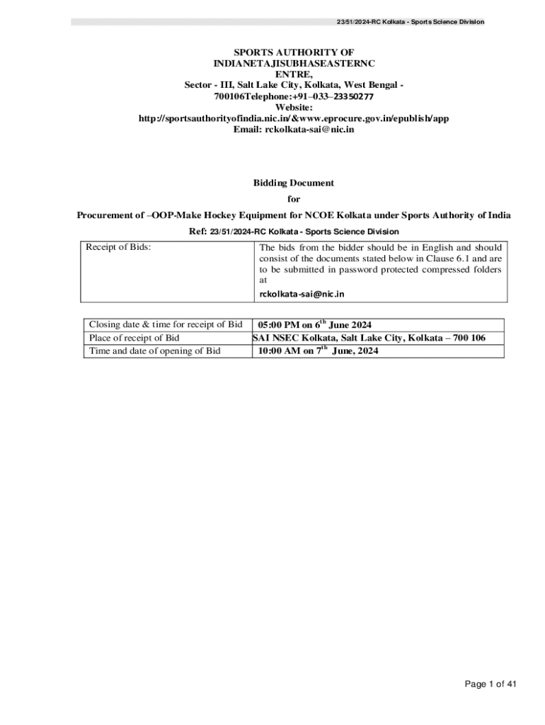 23/51/2024RC Kolkata Sports Science DivisionSPORTS AUTHORITY OF INDIANETAJISUBHASEASTERNC ENTRE, Sector III, Salt Lake City, Kolkata, West Bengal 700106Telephone:+9103323350277 Website: http://sportsauthorityofindia.nic.in/&www.eprocure.gov.in/epublish/app