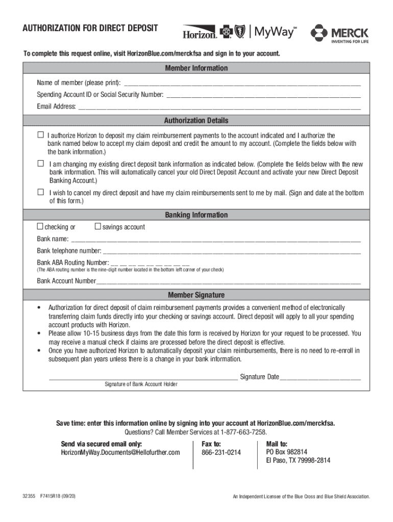 AUTHORIZATION FOR DIRECT DEPOSIT To complete this request online, visit HorizonBlue.com/merckfsa and sign in to your account.Member Information Name of member (please print): ___ Spending Account