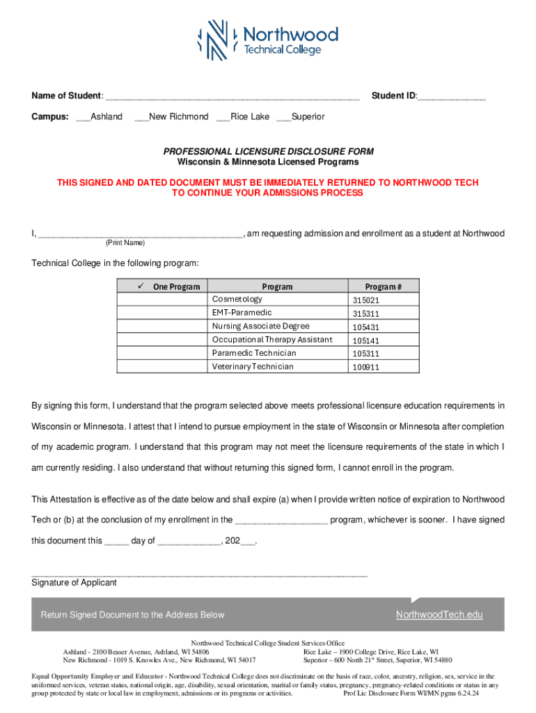 Name of Student: ___ Campus: ___AshlandStudent ID:______New Richmond ___Rice Lake ___SuperiorPROFESSIONAL LICENSURE DISCLOSURE FORM Wisconsin & Minnesota Licensed Programs THIS SIGNED AND DATED DOCUMENT