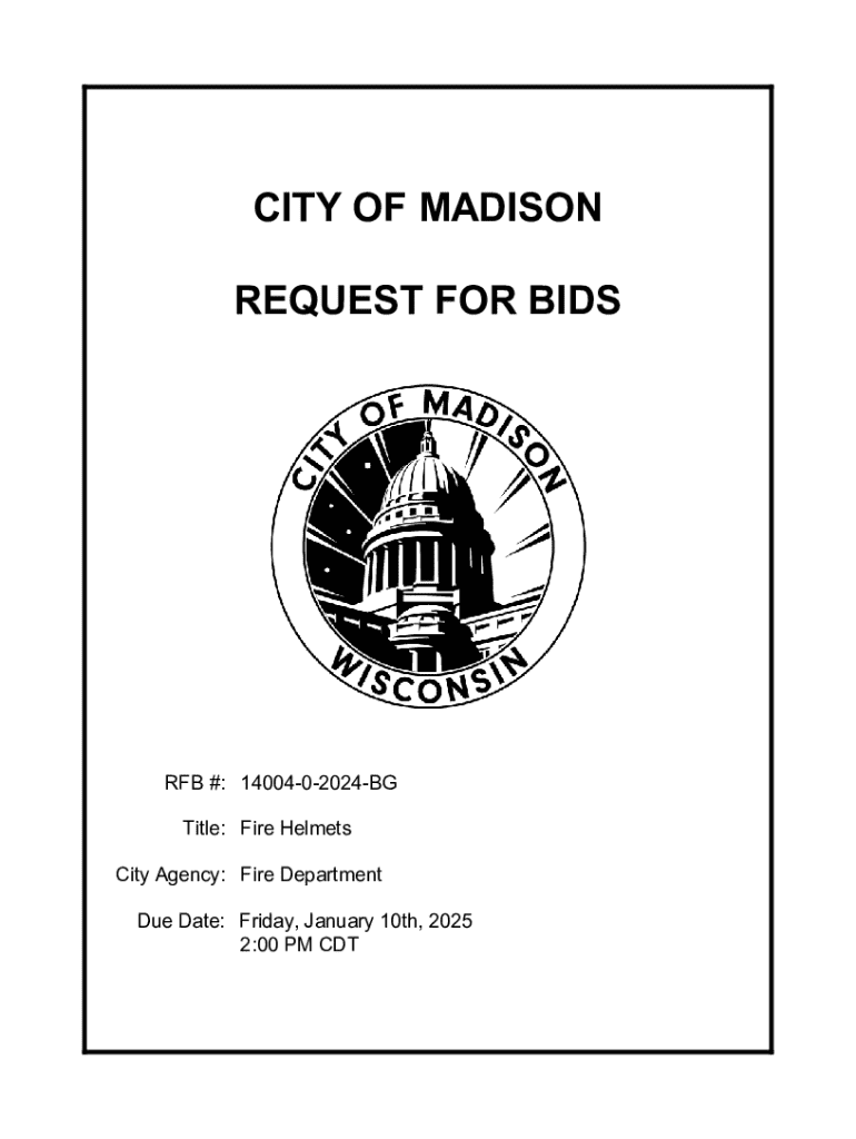 CITY OF MADISON REQUEST FOR BIDSRFB #: 1400402024BG Title: Fire Helmets City Agency: Fire Department Due Date: Friday, January 10th, 2025 2:00 PM CDTREQUEST FOR BIDSRFB # 1400402024BGTable of Contents