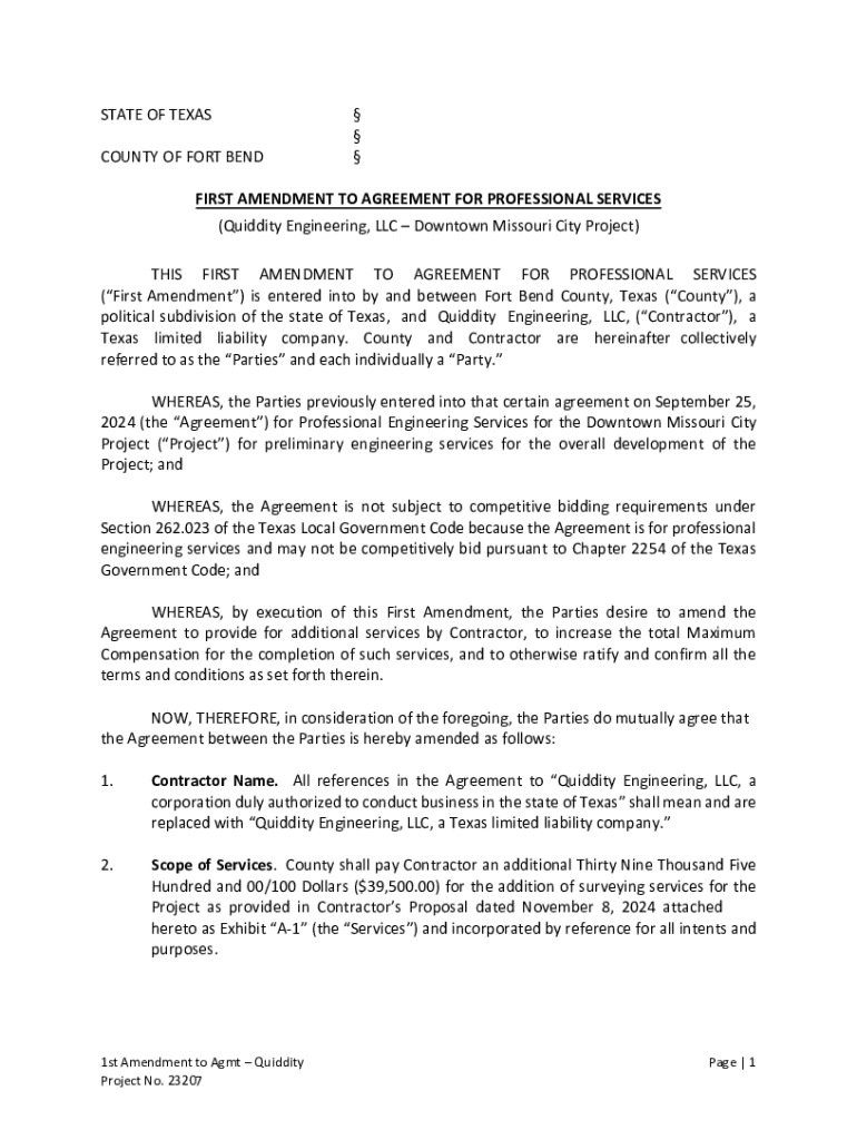STATE OF TEXAS COUNTY OF FORT BEND FIRST AMENDMENT TO AGREEMENT FOR PROFESSIONAL SERVICES (Quiddity Engineering, LLC Downtown Missouri City Project) THIS FIRST AMENDMENT TO AGREEMENT FOR PROFESSIONAL