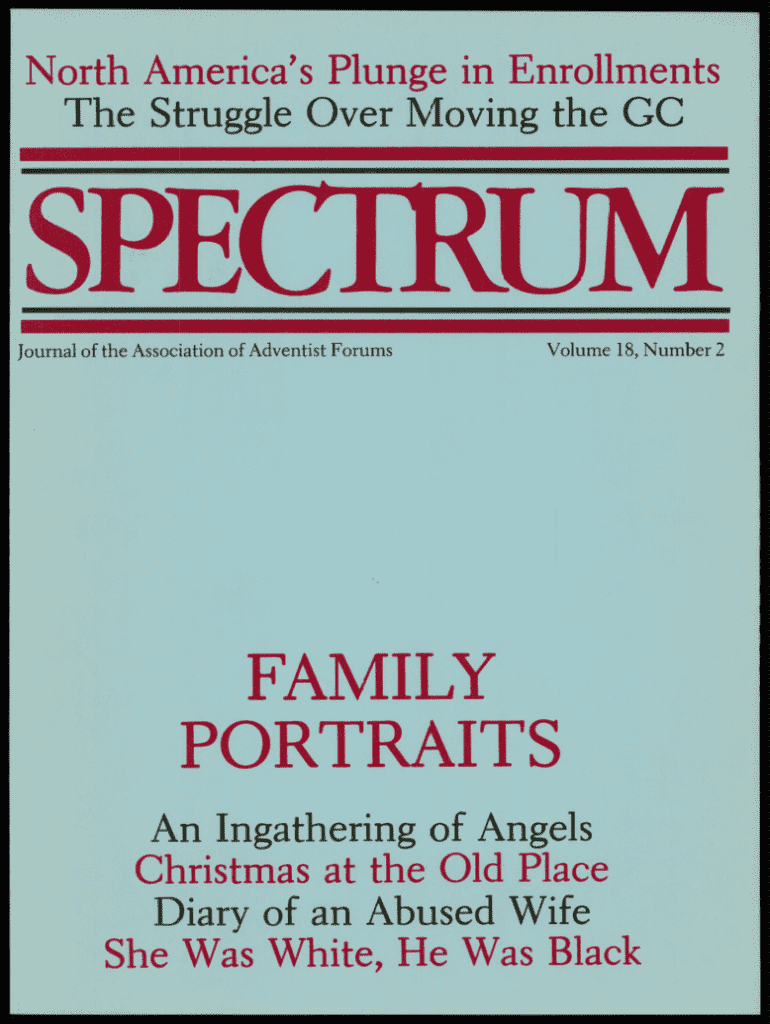 North America\'s Plunge in Enrollments The Struggle Over Moving the GCSPECTRUM Journal of the Association of Adventist ForumsVolume 18, Number 2FAMILY PORTRAITS An Ingathering of Angels Christmas
