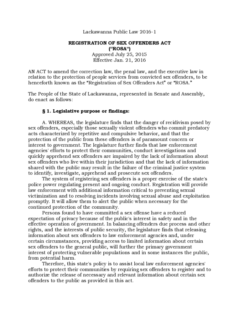 Lackawanna Public Law 20161 REGISTRATION OF SEX OFFENDERS ACT (ROSA) Approved July 25, 2015 Effective Jan. 21, 2016 AN ACT to amend the correction law, the penal law, and the executive law in relation