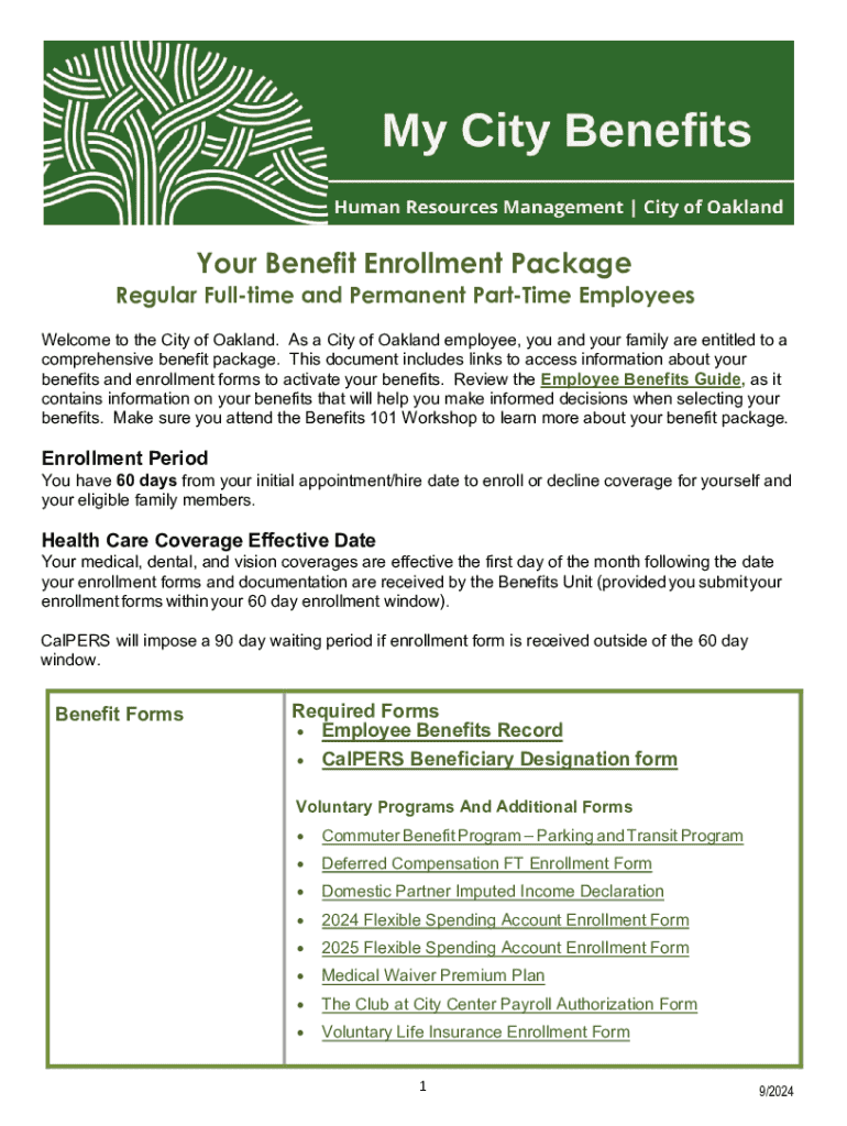 This document provides an overview of the comprehensive benefit package for City of Oakland employees, outlining the enrollment process, required forms, and important deadlines for health care coverage. It includes information on medical, dental, and vision plans as well as voluntary programs and resources to assist employees in making informed decisions about their benefits.