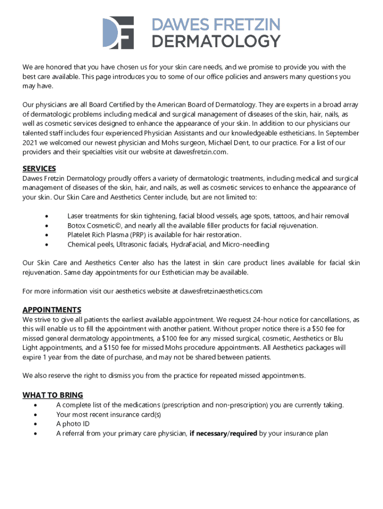 We are honored that you have chosen us for your skin care needs, and we promise to provide you with the best care available. This page introduces you to some of our office policies and answers many