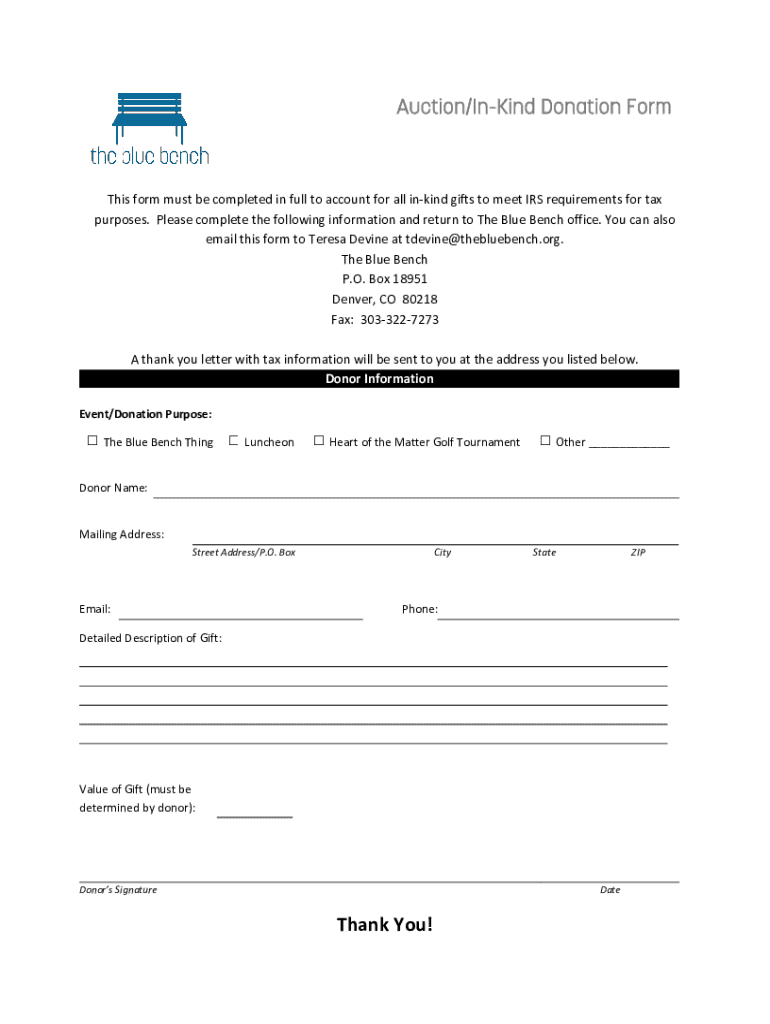 Auction/InKind Donation FormThis form must be completed in full to account for all inkind gifts to meet IRS requirements for tax purposes. Please complete the following information and return to The