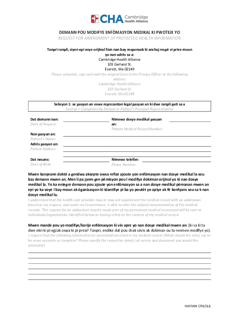 DEMANN POU MODIFYE ENFMASYON MEDIKAL KI PWOTEJE YO REQUEST FOR AMENDMENT OF PROTECTED HEALTH INFORMATION Tanpri ranpli, siyen epi voye orijinal fm nan bay responsab ki anchaj resp vi prive moun yo