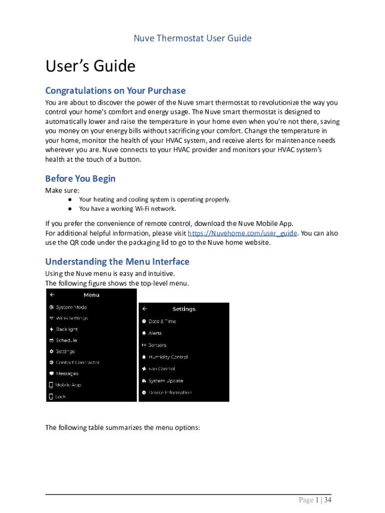 Nuve Thermostat User GuideUsers Guide Congratulations on Your Purchase You are about to discover the power of the Nuve smart thermostat to revolutionize the way you control your home\'s comfort and