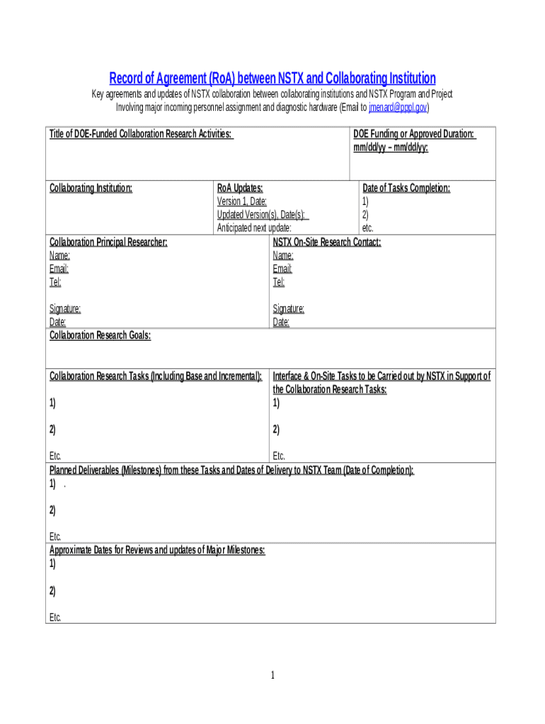 Template Record of Agreement (roa) Between Nstx and Collaborating Institution - nstx pppl instructions