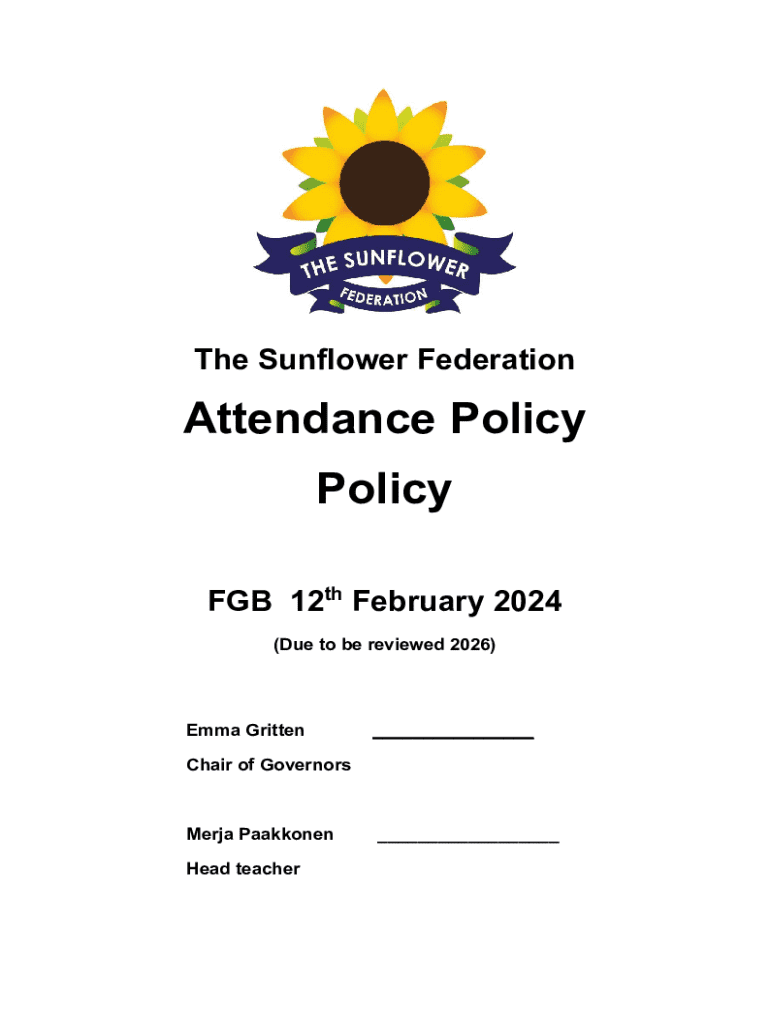 This document outlines the Attendance Policy of The Sunflower Federation, emphasizing the importance of regular attendance and punctuality among pupils to support their educational opportunities and wellbeing. It sets clear expectations, roles, and responsibilities of the Governing Board, Head Teacher, staff, parents, and pupils, along with guidelines for managing attendance, supporting vulnerable students, and addressing persistent and severe absence.