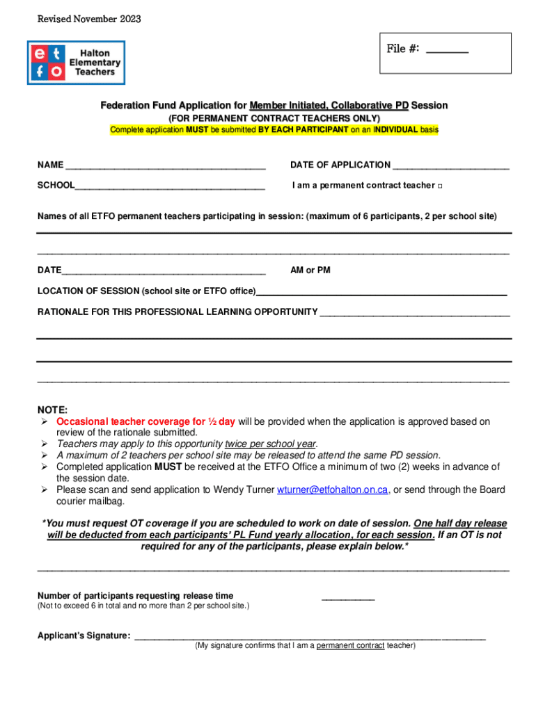 This application form is for permanent contract teachers to apply for participation in member initiated, collaborative professional development (PD) sessions. Each participant must complete the application individually, and it should be submitted at least two weeks before the session date.