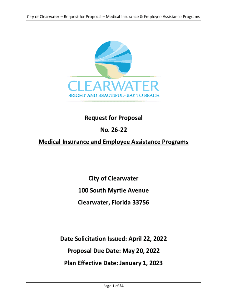 This document outlines the Request for Proposal (RFP) by the City of Clearwater for Medical Insurance and Employee Assistance Programs. It includes submission guidelines, proposal requirements, evaluation criteria, and details on the coverage sought. Proposals are due by May 20, 2022, with the plan effective date set for January 1, 2023.