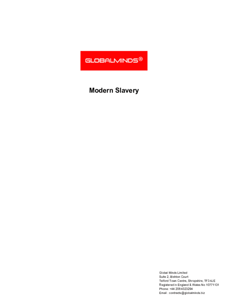 Modern SlaveryGlobal Minds Limited Suite 2, Bishton Court Telford Town Centre, Shropshire, TF3 4JE Registered in England & Wales No 10771131 Phone: +44 208 4323294 Email : contracts@globalminds.bizTable