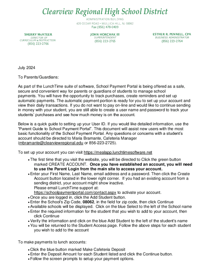 Clearview Regional High School District ADMINISTRATION BUILDING 420 CEDAR ROAD MULLICA HILL, NJ 08062Fax (856) 4780409 SHERRY McATEERJOHN HORCHAK IllESTHER R. PENNELL, CPADIRECTOR OF CURRICULUM &