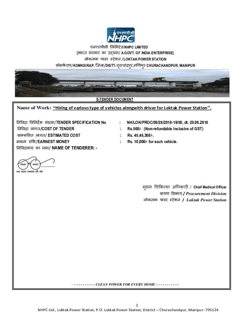 /NHPC LIMITED [ / A GOVT. OF INDIA ENTERPRISE] /LOKTAK POWER STATION /KOMKEIRAP, /DISTT, CHURACHANDPUR, MANIPURETENDER DOCUMENTName of Work: Hiring of various type of vehicles alongwith driver for