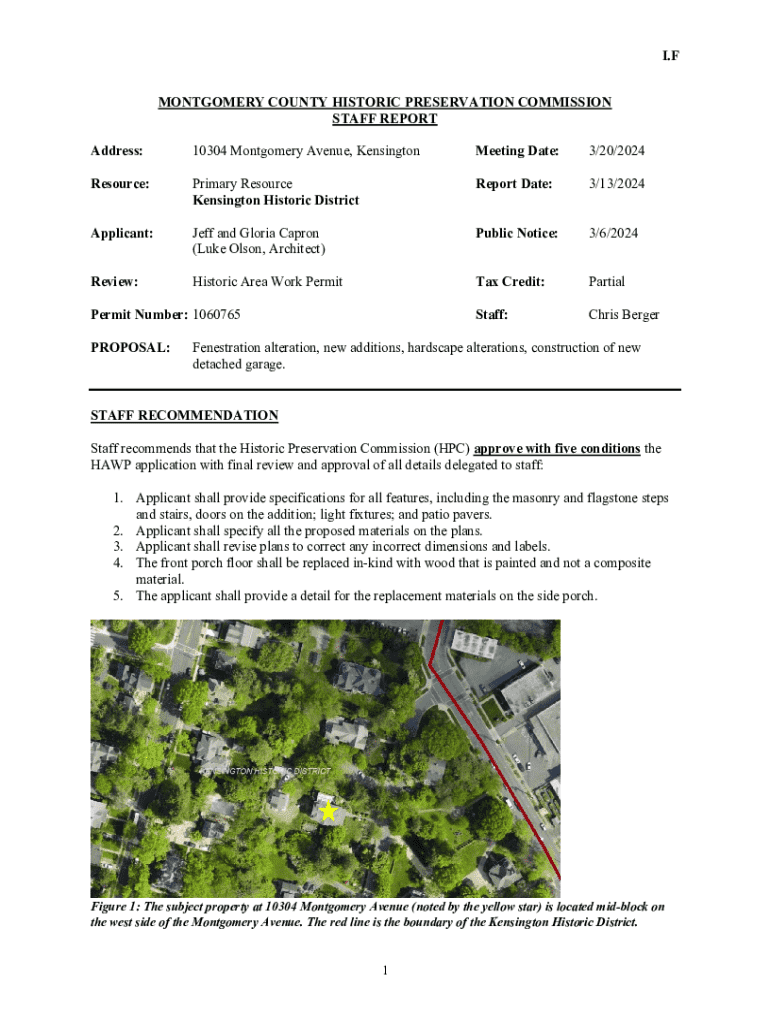 I.F MONTGOMERY COUNTY HISTORIC PRESERVATION COMMISSION STAFF REPORT Address:10304 Montgomery Avenue, KensingtonMeeting Date:3/20/2024Resource:Primary Resource Kensington Historic DistrictReport Date:3/13/2024Applicant:Jeff