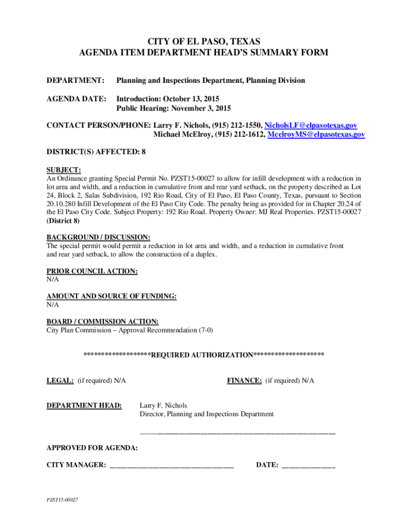 CITY OF EL PASO, TEXAS AGENDA ITEM DEPARTMENT HEADS SUMMARY FORM DEPARTMENT:Planning and Inspections Department, Planning DivisionAGENDA DATE:Introduction: October 13, 2015 Public Hearing: November