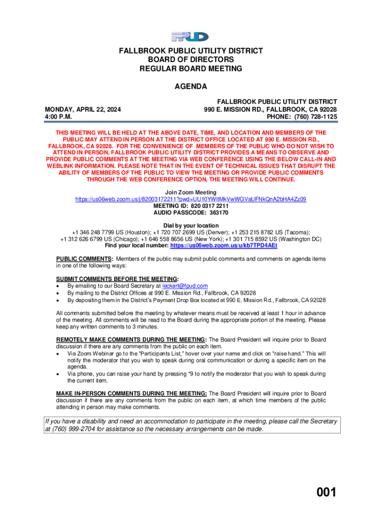 Get the free Fallbrook Public Utility District Board Meeting Agenda