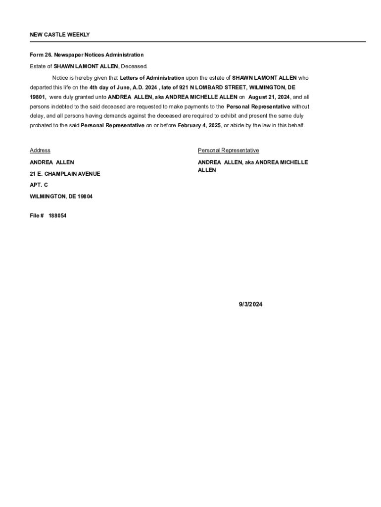 NEW CASTLE WEEKLY Form 26. Newspaper Notices AdministrationEstate of SHAWN LAMONT ALLEN, Deceased. Notice is hereby given that Letters of Administration upon the estate of SHAWN LAMONT ALLEN who departed