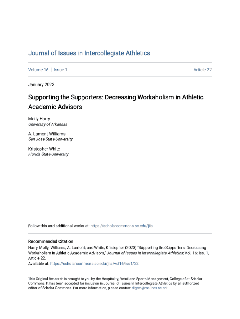 Journal of Issues in Intercollegiate Athletics Volume 16Issue 1Article 22January 2023Supporting the Supporters: Decreasing Workaholism in Athletic Academic Advisors Molly Harry University of ArkansasA.