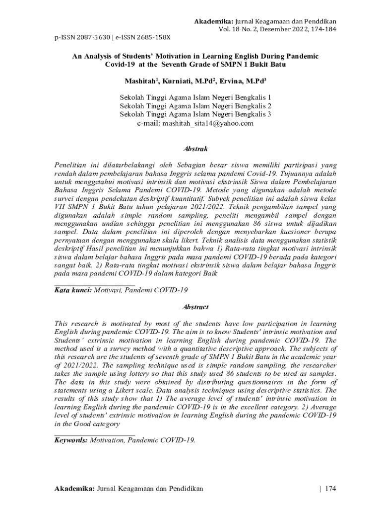 Akademika: Jurnal Keagamaan dan Penddikan Vol. 18 No. 2, Desember 2022, 174184 pISSN 20875630 | eISSN 2685158XAn Analysis of Students Motivation in Learning English During Pandemic Covid19 at the