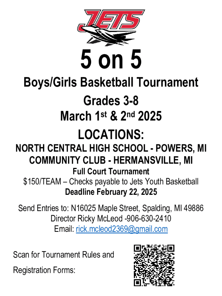 5 on 5 Boys/Girls Basketball Tournament Grades 38 March 1st & 2nd 2025 LOCATIONS: NORTH CENTRAL HIGH SCHOOL POWERS, MI COMMUNITY CLUB HERMANSVILLE, MI Full Court Tournament $150/TEAM Checks payable