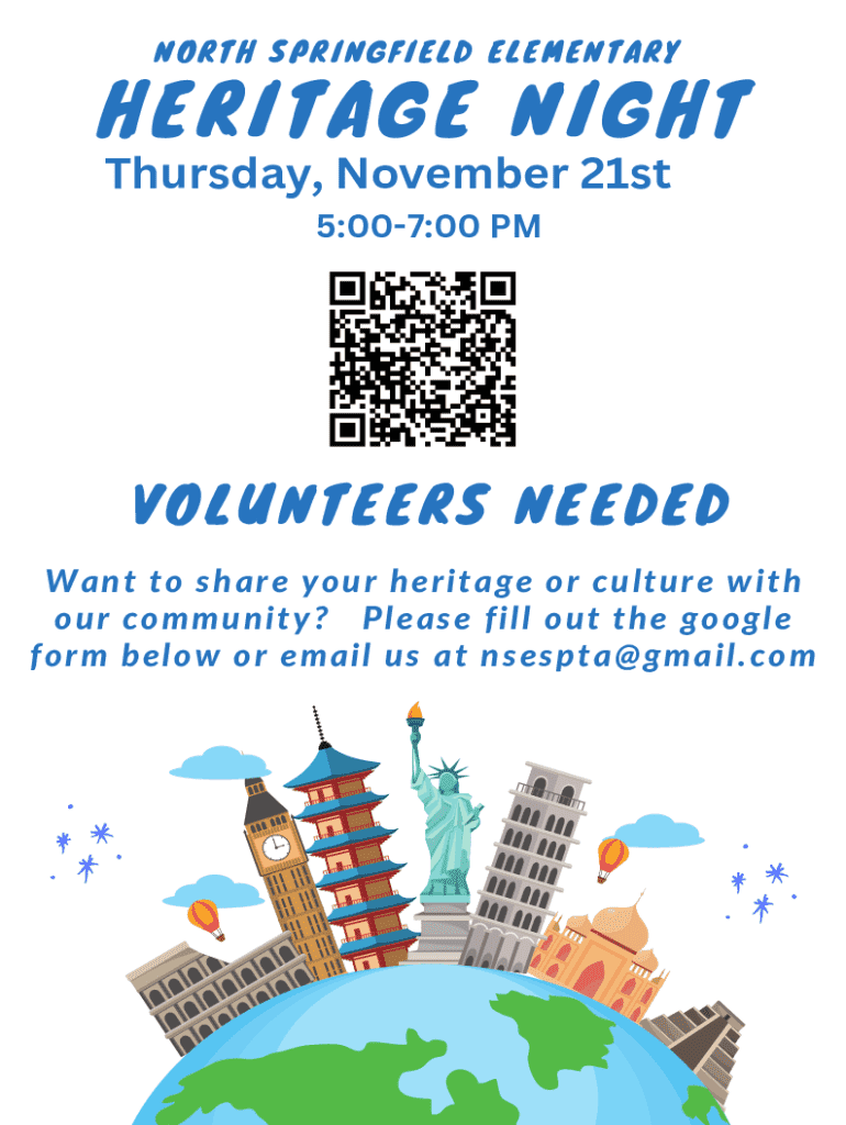 NORTH SPRINGFIELD ELEMENTARYHERITAGE NIGHT Thursday, November 21st 5:007:00 PMVOLUNTEERS NEEDED Want to share your heritage or culture with our community? Please fill out the google form below or