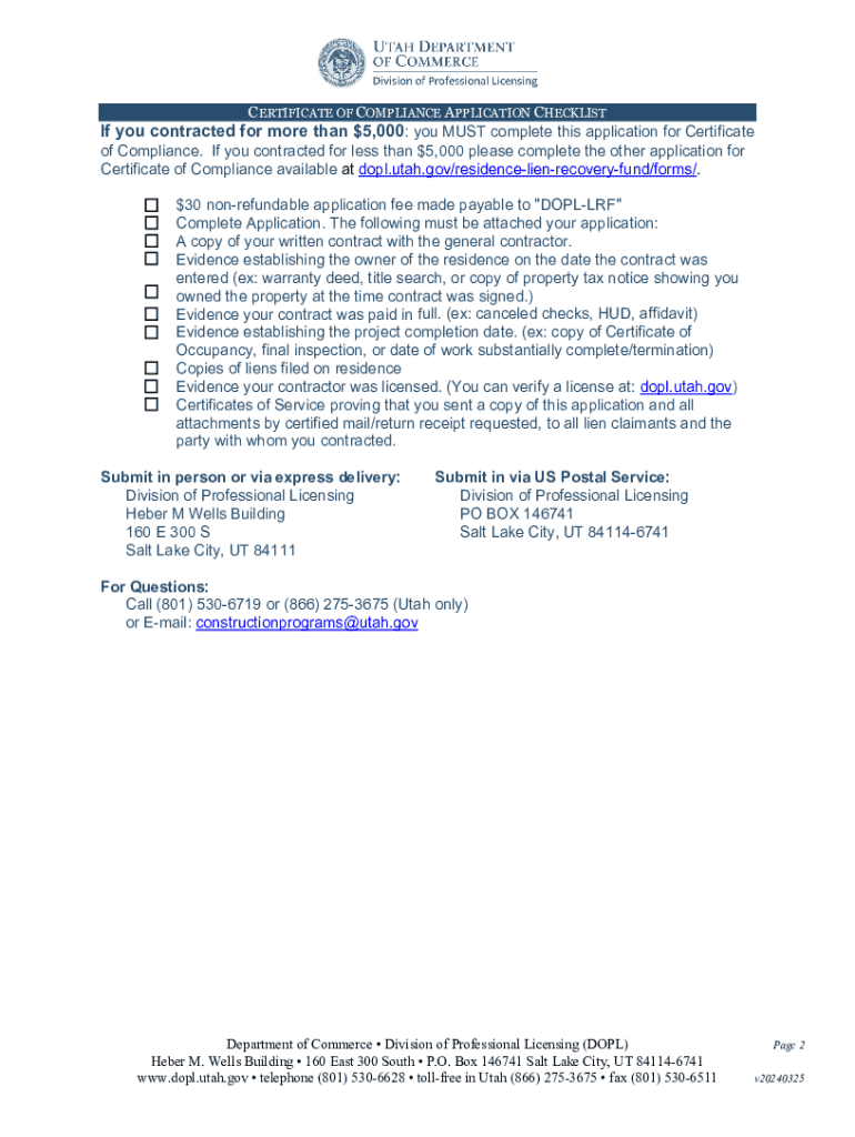 Clear FormDear Resident: RE:HOMEOWNER CERTIFICATE OF COMPLIANCE RESIDENCE LIEN RESTRICTION AND LIEN RECOVERY FUND ACTThe Utah Residence Lien Restriction and Lien Recovery Fund Act, Utah Code 3811,
