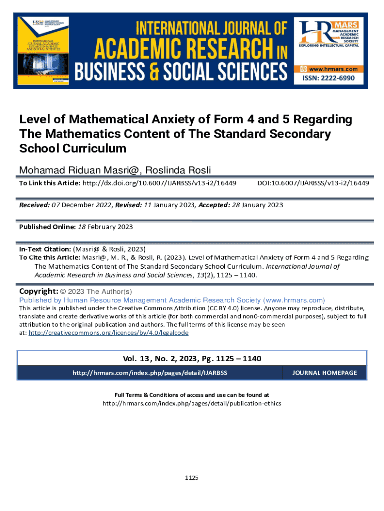 Level of Mathematical Anxiety of Form 4 and 5 Regarding The Mathematics Content of The Standard Secondary School Curriculum Mohamad Riduan Masri@, Roslinda Rosli To Link this Article: http://dx.doi.org/10.6007/IJARBSS/v13i2/16449DOI:10.6007/IJARBSS/v13i2/16449Received: