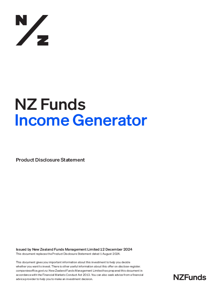NZ Funds Income Generator Product Disclosure StatementIssued by New Zealand Funds Management Limited 12 December 2024 This document replaces the Product Disclosure Statement dated 1 August 2024. This