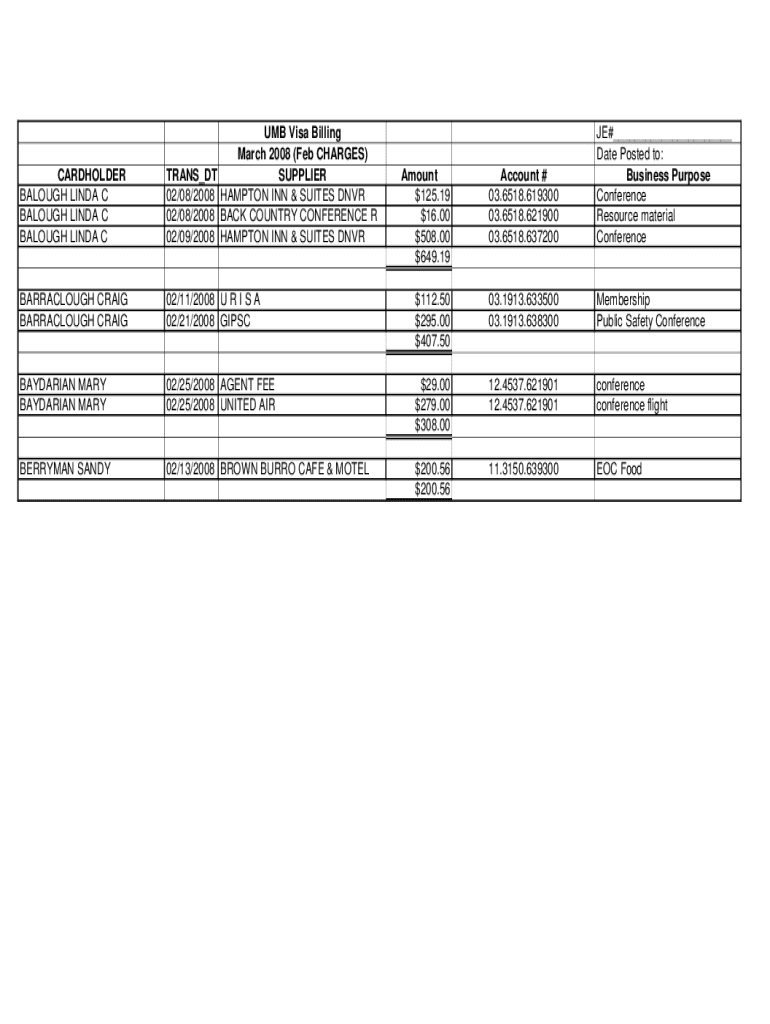 CARDHOLDER BALOUGH LINDA C BALOUGH LINDA C BALOUGH LINDA CUMB Visa Billing March 2008 (Feb CHARGES) TRANS_DT SUPPLIER 02/08/2008 HAMPTON INN & SUITES DNVR 02/08/2008 BACK COUNTRY CONFERENCE R 02/09/2008