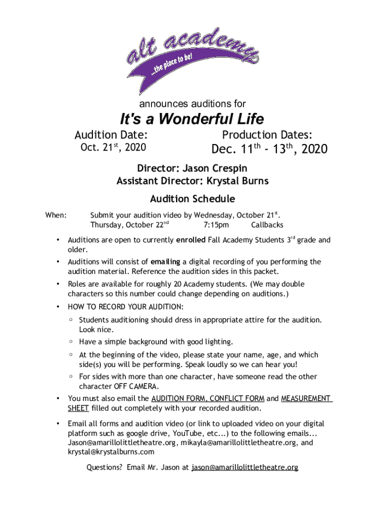 announces auditions forIt\'s a Wonderful Life Audition Date:Production Dates:Dec. 11th 13th, 2020stOct. 21 , 2020Director: Jason Crespin Assistant Director: Krystal Burns Audition Schedule When:Submit