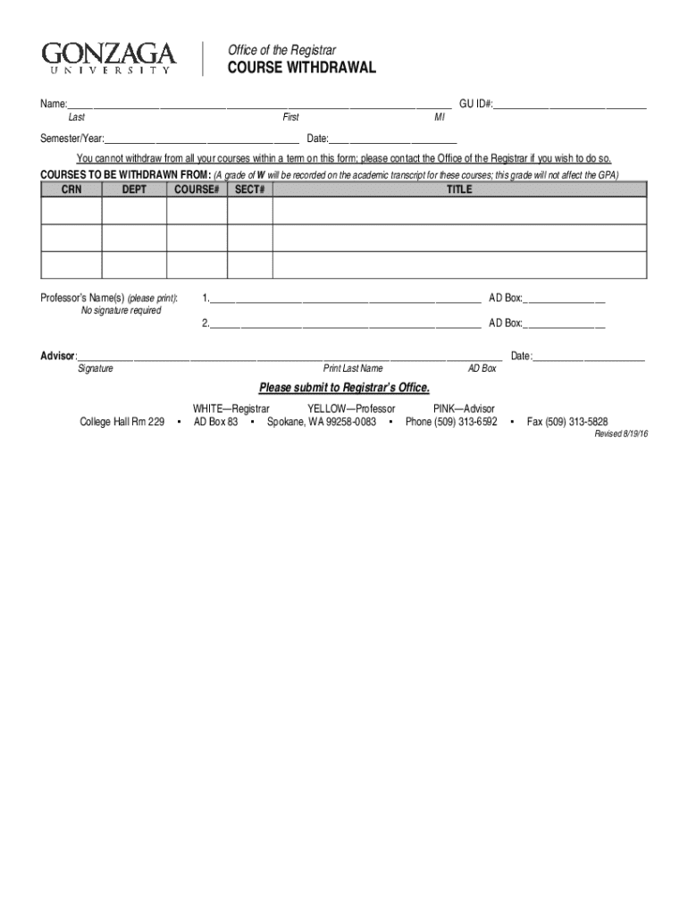 Office of the RegistrarCOURSE WITHDRAWAL Name:___ GU ID#:___ LastFirstMISemester/Year:___ Date:___ You cannot withdraw from all your courses within a term on this form; please contact the Office of