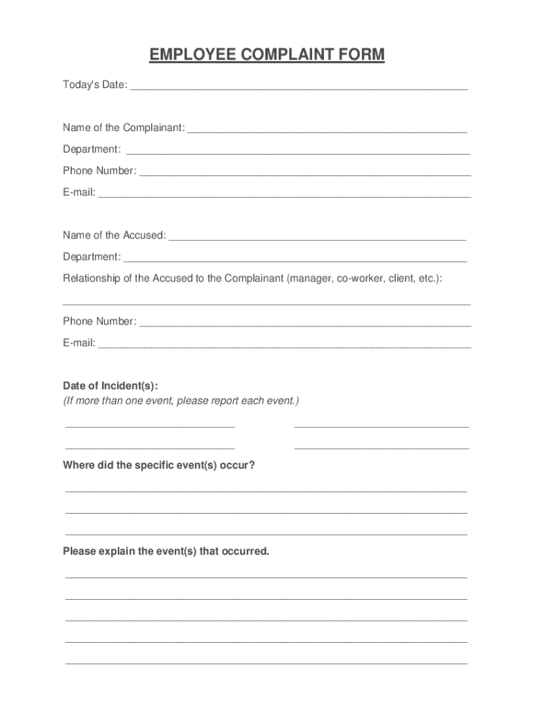 EMPLOYEE COMPLAINT FORM Today\'s Date: ___Name of the Complainant: ___ Department: ___ Phone Number: ___ Email: ___Name of the Accused: ___ Department: ___ Relationship of the Accused to the Complainant