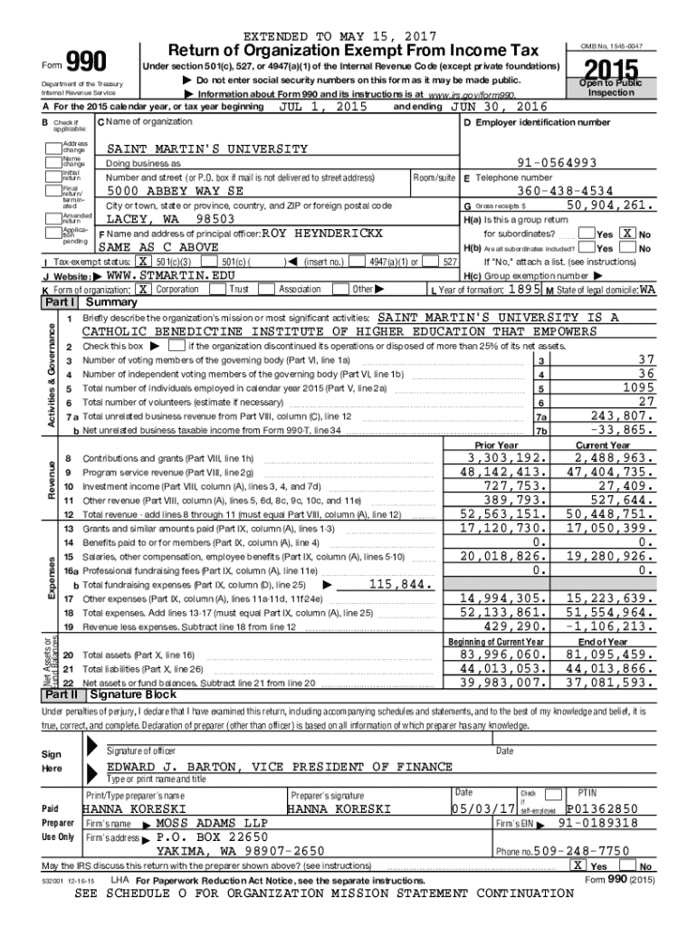 EXTENDED TO MAY 15, 2017 FormReturn of Organization Exempt From Income Tax990OMB No. 154500472015Under section 501(c), 527, or 4947(a)(1) of the Internal Revenue Code (except private foundations)|