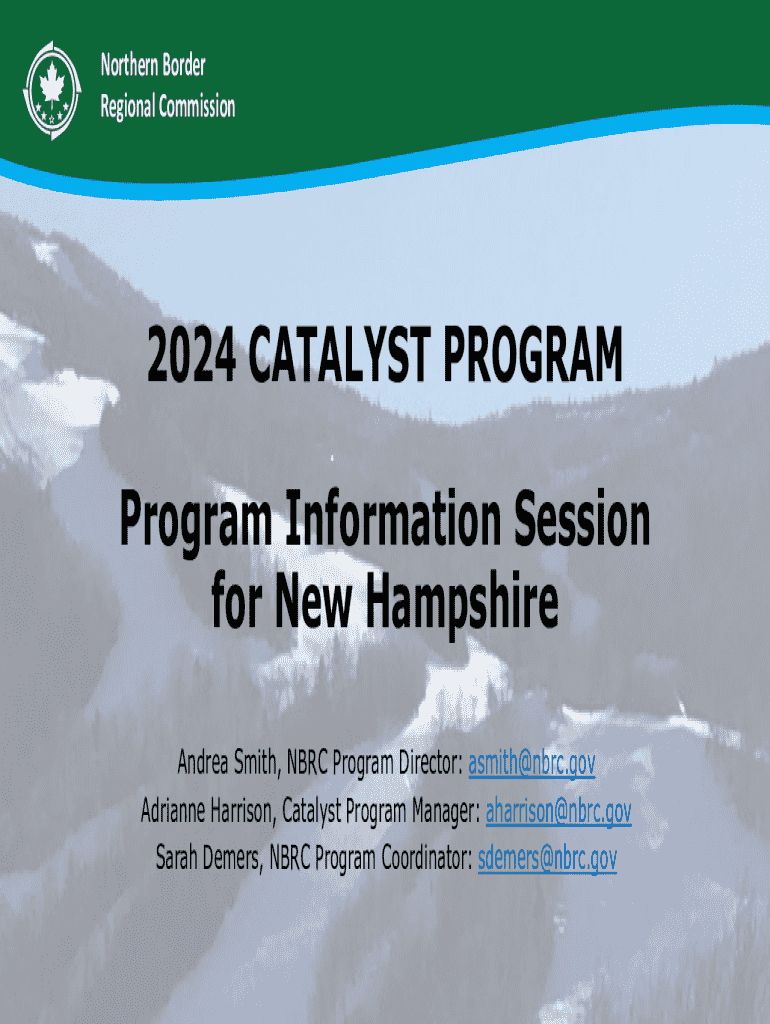 Northern Border Regional Commission2024 CATALYST PROGRAM Program Information Session for New Hampshire Andrea Smith, NBRC Program Director: asmith@nbrc.gov Adrianne Harrison, Catalyst Program Manager: