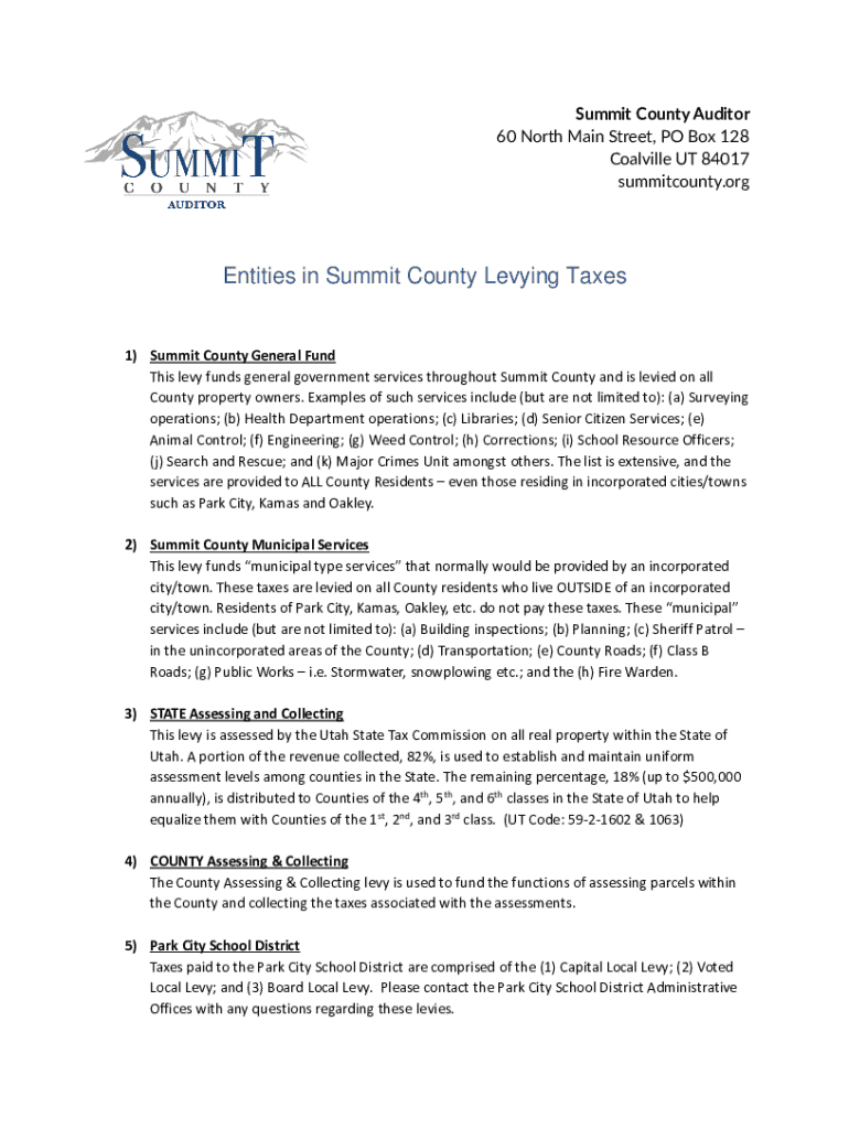 Summit County Auditor 60 North Main Street, PO Box 128 Coalville UT 84017 summitcounty.orgEntities in Summit County Levying Taxes 1) Summit County General Fund This levy funds general government services