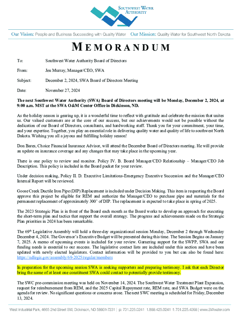 This document is a memorandum detailing the agenda for the Southwest Water Authority Board of Directors meeting scheduled for December 2, 2024. It includes various reports, updates, and decisions to be made concerning the operations and financial matters of the authority. The meeting will address strategic plans, project updates, and budget approvals, among other topics.