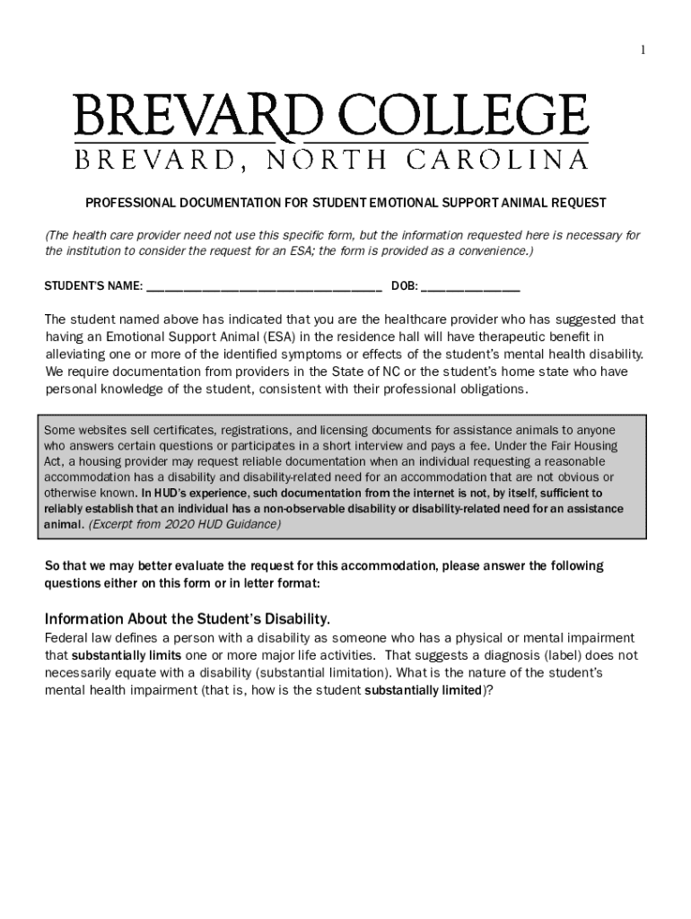 Get the free 1 Emotional Support Animal Documentation Form Student ...