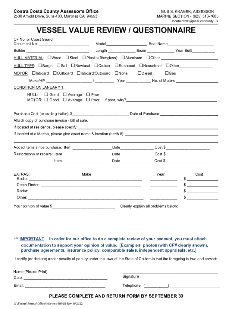 RESETPRINTContra Costa County Assessor\'s OfficeGUS S. KRAMER, ASSESSOR MARINE SECTION (925) 31376052530 Arnold Drive, Suite 400, Martinez CA 94553boataircraft@assr.cccounty.usVESSEL VALUE REVIEW
