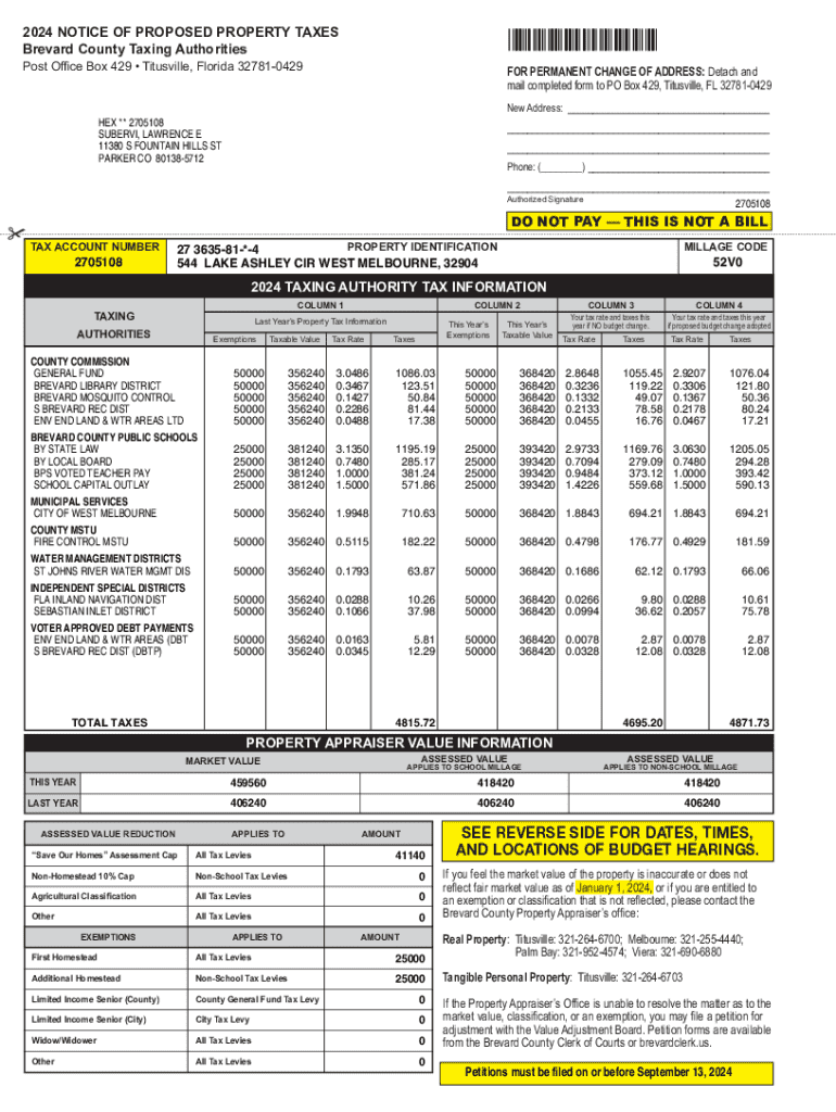 *2705108*2024 NOTICE OF PROPOSED PROPERTY TAXES Brevard County Taxing Authorities 3RVW2IFH%R[7LWXVYLOOH)ORULGDFOR PERMANENT CHANGE OF ADDRESS: Detach and PDLOFRPSOHWHGIRUPWR32%R[7LWXVYLOOH)/ NHZ$GGUHVV